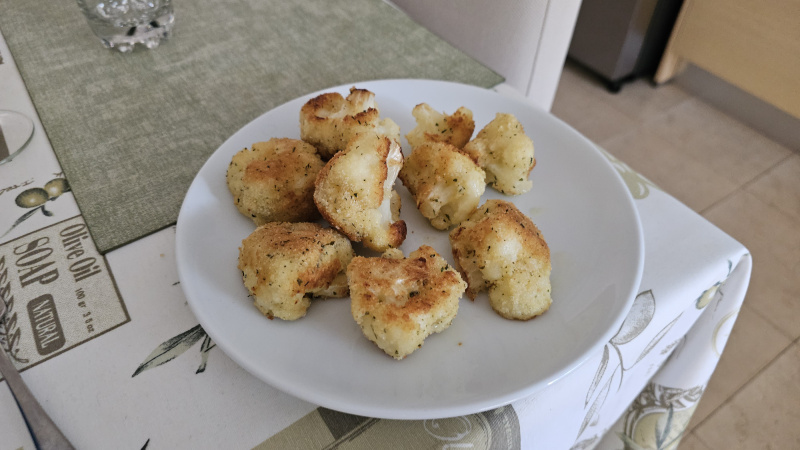 А делается очень просто. Цветную капусту разобрать на соцветия (самые крупные еще и разрезать пополам), кинуть в подсоленный кипяток и варить буквально пару минут. Потом охладить под холодной водой, в плошку разбить одно яйцо, как следует перемешать, каждое соцветие обмакнуть в яйцо, обвалять в обсыпке (в наших краях продается обсыпка с сухой петрушкой, я такую и беру), и на нагретую сковородку с достаточным количеством оливкового масла (обсыпка масло хорошо впитывает). Обжарить со всех сторон на не очень высокой температуре. В принципе, можно потом еще и на 10 минут в разогретую на 200 градусов духовку, но это необязательно, потому что и так хорошо.