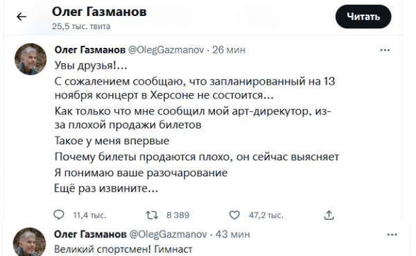 Также пишут, что в Твиттере Газманова сегодня утром был вот этот пост. Но сейчас там его нет.