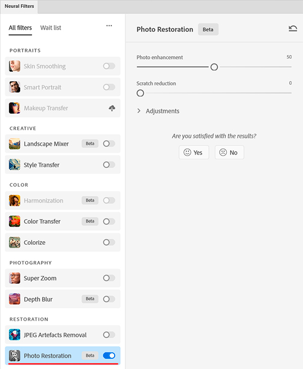 Запускаете бету, загружаете фото, которое нужно отреставрировать, идете в Filter - Neural Filters, там включаете Photo Restoration и с ним играетесь.