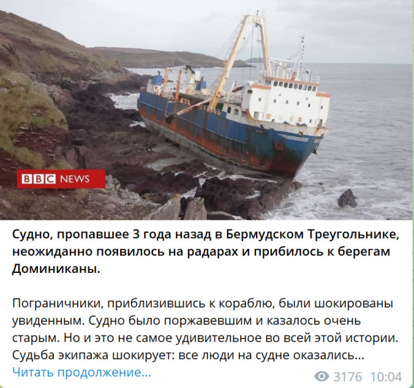 Стандартный приём по раскрутке канала. Заметка. Фото от совершенно другой статьи в уважаемом издании. Текст - чистый горячечный бред, потому что судно пропало не 3 года назад, а 100 лет назад, ни на каких радарах оно не появлялось, ну и уж никаких людей там совершенно точно не было.