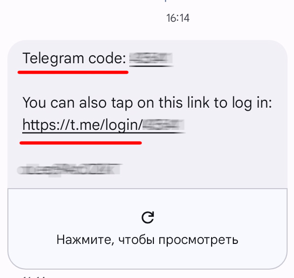 3. Однако предположим, что у вас под рукой нет Телеграма. Что может сделать злоумышленник? Заказать отправку SMS на ваш номер, чтобы подтвердить вход в новую копию Телеграма. И вам придет вот такая SMS, из которой тоже хорошо видно, что это код Телеграм для входа в другом приложении.