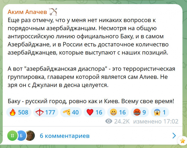 Upd: В Азербайджане собираются закрыть все русские школы. Также читал, что они хотят запретить вещание российских телеканалов - очень правильное решение.