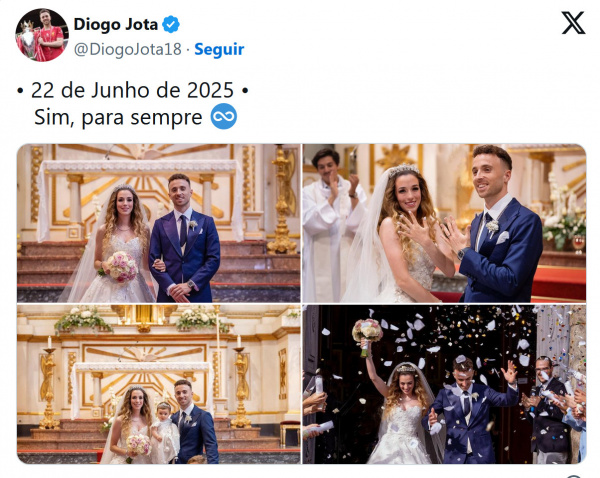 Меньше двух недель назад Жота женился на своей невесте Руте Кардосо. На фотографиях со свадьбы можно увидеть пару вместе с тремя детьми: Денисом, родившимся в 2021 году, Дуарте, родившимся в 2023 году, и девочкой, родившейся в прошлом году.