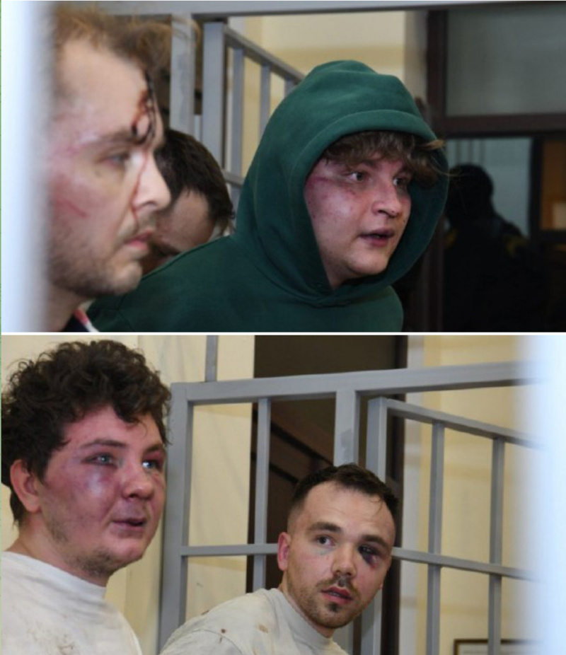 Их имена не называются. СМИ публикуют фото и видео возле суда и из зала суда. На кадрах видно, что молодые мужчины сильно избиты, силовики применяют к ним насилие и при перемещении.