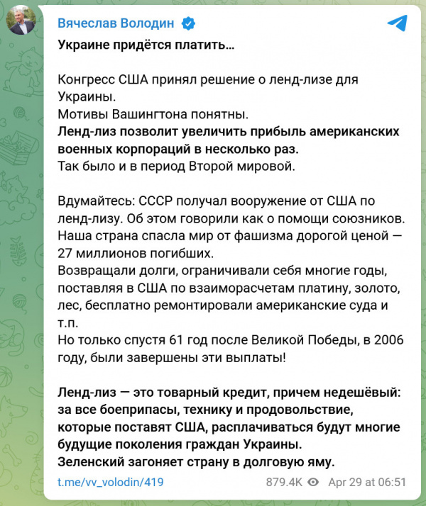 Интересно, а он эту хрень про ленд-лиз несет, потому что ему по должности это полагается, или потому что он в школе очень плохо учился и не выучил, что такое, вообще говоря, ленд-лиз?