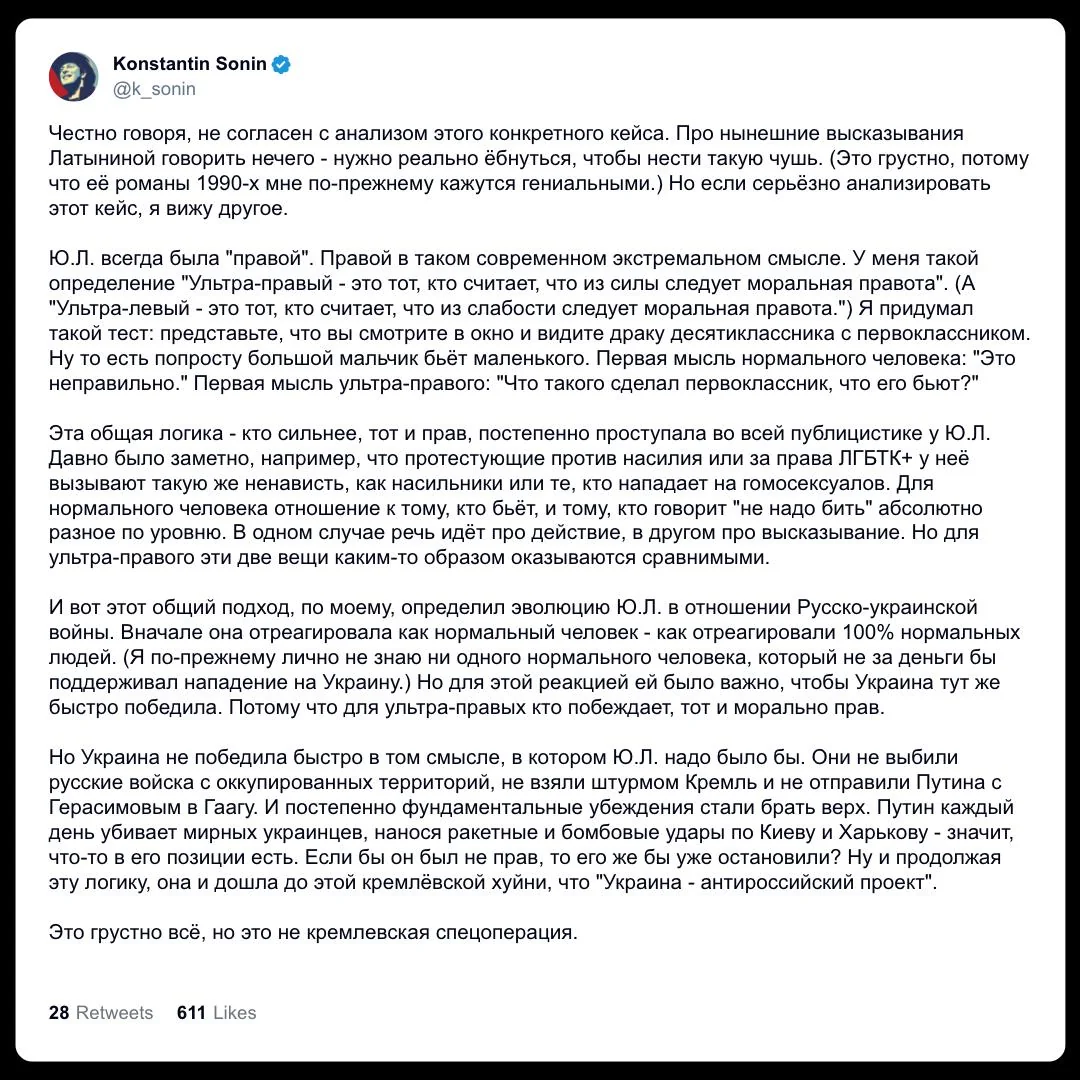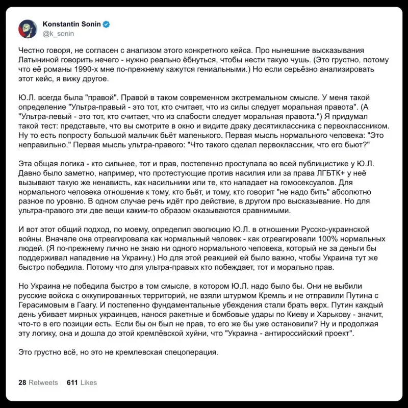 Константин Сонин пытается анализировать, почему треканулась баба Юля. Мне не очень понятно, зачем вообще этим пытаться заниматься: по-моему, достаточно самого факта того, что она сейчас несет.