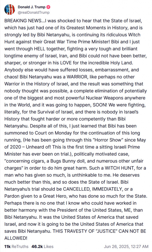 СРОЧНЫЕ НОВОСТИ... Я был потрясён, узнав, что Государство Израиль, которое только что пережило один из СВОИХ ВЕЛИЧАЙШИХ МОМЕНТОВ В ИСТОРИИ, и которым так мощно руководит Биби Нетаньяху, продолжает эту нелепую ОХОТУ НА ВЕДЬМ против своего Великого Премьер-министра Военного Времени! Мы с Биби прошли ЧЕРЕЗ АД вместе, сражаясь с очень жёстким и блестящим давним врагом Израиля — Ираном, и Биби просто не мог быть лучше, умнее или сильнее в своей ЛЮБВИ к этой невероятной Святой Земле. Любой другой бы потерпел поражение, позор и ХАОС! Биби Нетаньяху был ВОИНОМ, возможно, самым великим Воином в истории Израиля, и результат был таким, во что никто не верил — полное устранение одной из самых крупных и мощных ядерных угроз в мире, и это должно было случиться СКОРО! Мы сражались буквально за выживание Израиля, и не было никого в истории Израиля, кто бы боролся сильнее и компетентнее, чем Биби Нетаньяху.