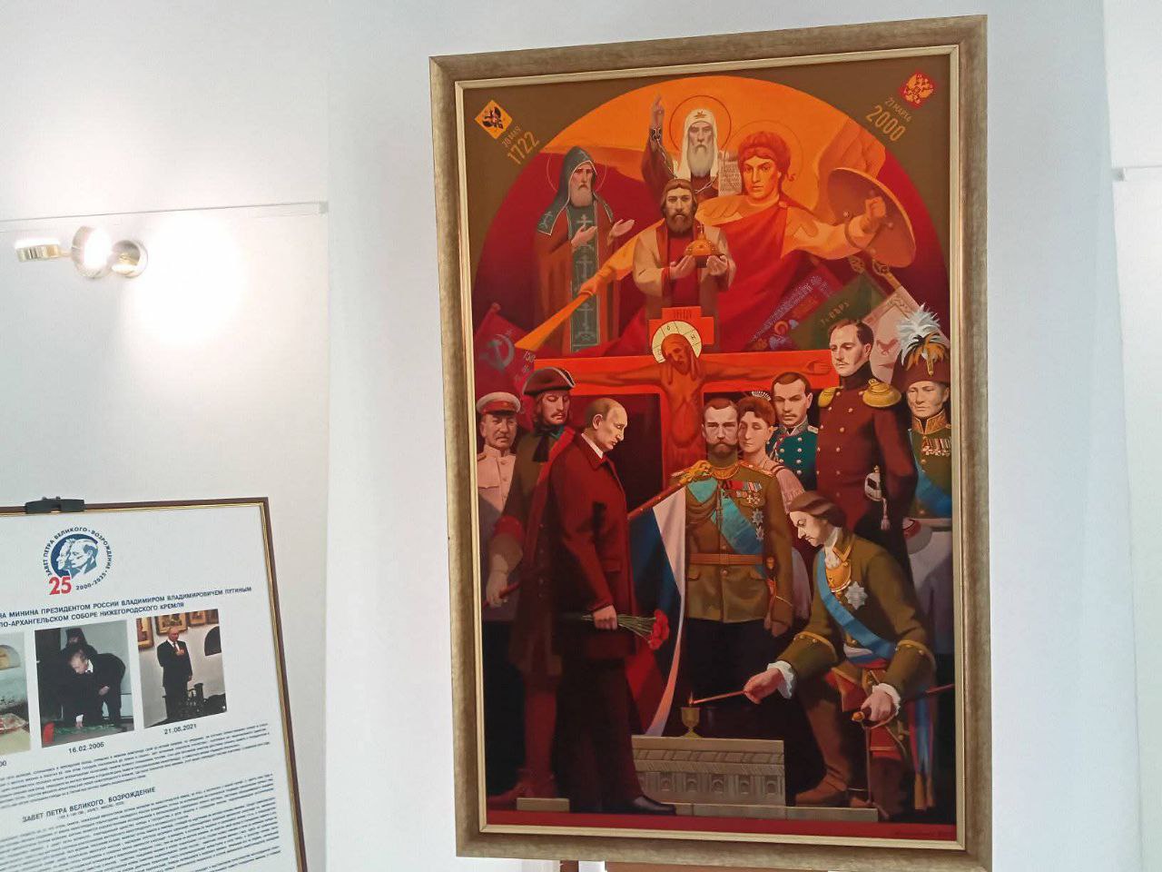 Картину «Завет Петра Великого. Возрождение» представили нижегородцам в выставочном зале Спасо-Преображенской колокольни. Художник Сергей Малиновский по благословению митрополита Нижегородского и Арзамасского Георгия написал императора Петра Первого, который преклонил колено для зажигания лампады перед другим великим правителем России, уроженцем Петербурга. (Отсюда.)