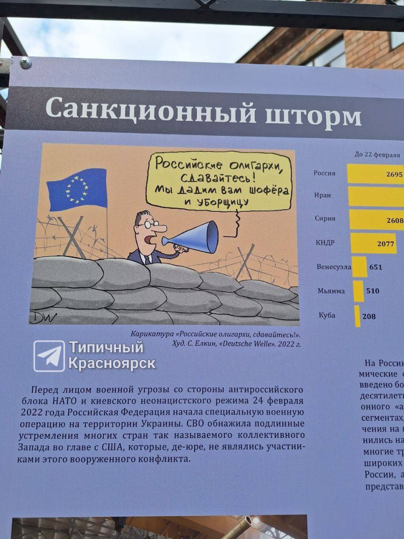 Также на стенде в разделе о «санкционном шторме» на РФ демонстрируется карикатура художника Сергея Елкина. (Отсюда.)
