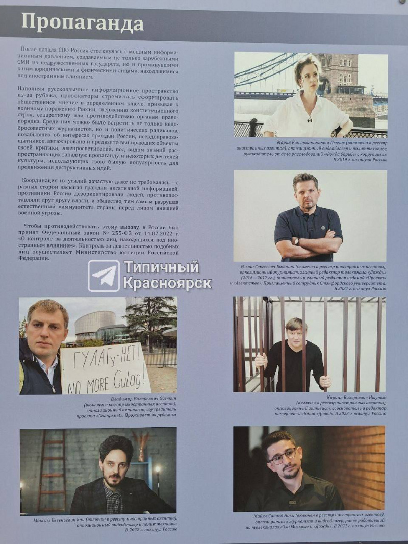 В Красноярске ко Дню России открыли выставку «иностранных агентов», которые, по версии местных властей, «разрушают естественный „иммунитет“ страны перед лицом внешней военной угрозы».