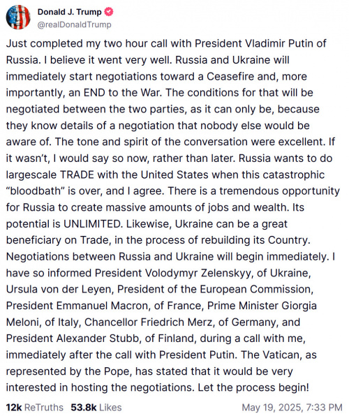 Только что завершил двухчасовой разговор с президентом России Владимиром Путиным. Считаю, что он прошел очень хорошо. Россия и Украина немедленно начнут переговоры о прекращении огня и, что еще более важно, о ПРЕКРАЩЕНИИ войны. Условия этого будут согласованы между двумя сторонами, как и должно быть, поскольку только они знают детали переговоров, о которых никто другой не может знать. Тон и дух разговора были отличными. Если бы это было не так, я бы сказал об этом сейчас, а не позже. Россия хочет вести крупномасштабную ТОРГОВЛЮ с Соединенными Штатами, когда эта катастрофическая «кровавая баня» закончится, и я согласен с этим. У России есть огромные возможности для создания огромного количества рабочих мест и богатства. Ее потенциал НЕОГРАНИЧЕН. Точно так же Украина может получить огромную выгоду от торговли в процессе восстановления своей страны. Переговоры между Россией и Украиной начнутся немедленно. Об этом я сообщил президенту Украины Владимиру Зеленскому, президенту Европейской комиссии Урсуле фон дер Ляйен, президенту Франции Эммануэлю Макрону, премьер-министру Италии Джорджии Мелони, канцлеру Германии Фридриху Мерцу и президенту Финляндии Александру Стаббу во время телефонного разговора со мной сразу после разговора с президентом Путиным. Ватикан в лице Папы Римского заявил, что был бы очень заинтересован в проведении переговоров. Да начнется процесс!