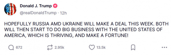 НАДЕЮСЬ, ЧТО РОССИЯ И УКРАИНА ЗАКЛЮЧАТ СОГЛАШЕНИЕ НА ЭТОЙ НЕДЕЛЕ. ОБЕ СТОРОНЫ ЗАТЕМ НАЧНУТ ВЕСТИ БОЛЬШОЙ БИЗНЕС С СОЕДИНЕННЫМИ ШТАТАМИ АМЕРИКИ, КОТОРЫЕ ПРОЦВЕТАЮТ, И ОБОГАТЯТСЯ!
