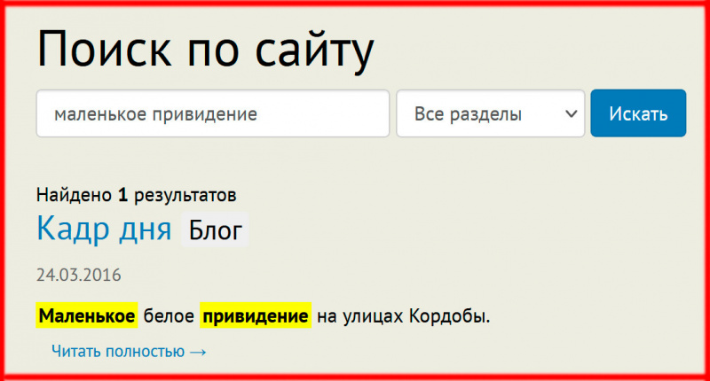 Например, поиск Google мне в упор никогда не мог выдать правильную ссылку на запрос "Маленькое привидение" (фото из Кордобы) - он выдавал тонну всякого мусора, но только не требуемую запись. А наш поиск выдает только одну ссылку - правильную.