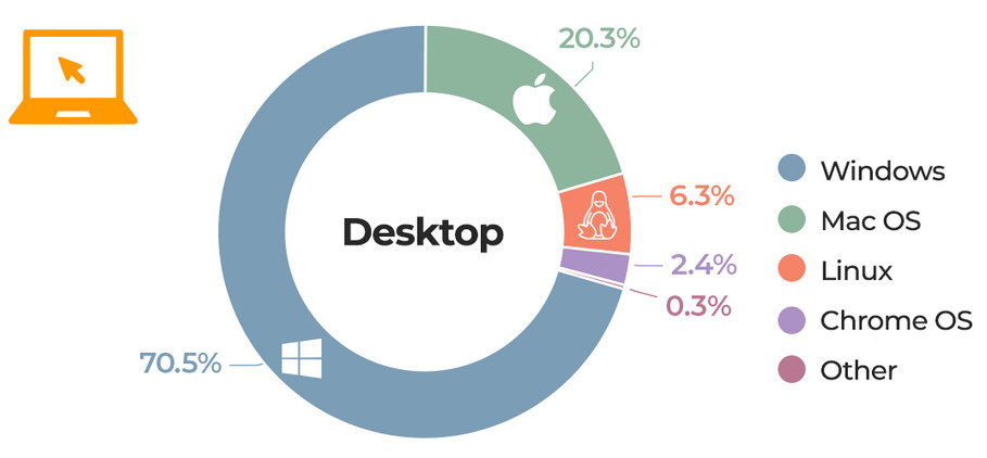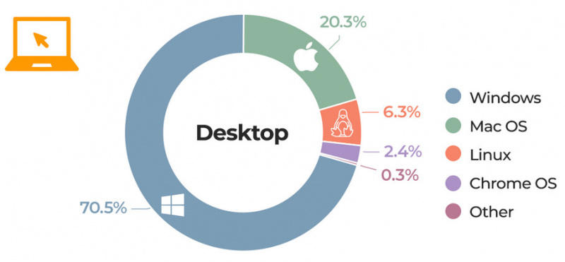 Также интересно было посмотреть статистику, не относящуюся к тематике сайта - распределение операционных систем и так далее. Ведь это один из самых посещаемых сайтов в мире, его аудитория оценивается в 3,5–4,1 млрд визитов в месяц. (Количество уникальных посетителей сервис не раскрывает.)