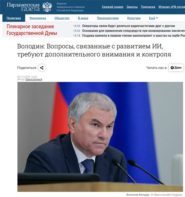 Вопросы, связанные с развитием искусственного интеллекта, требуют не только дополнительного внимания, но и контроля, серьезные наработки в регулировании этой сферы есть у Китая. Об этом председатель ПА ОДКБ, председатель Госдумы Вячеслав Володин сказал 8 декабря на совместном заседании Совета и 18-м пленарном заседании ПА ОДКБ.