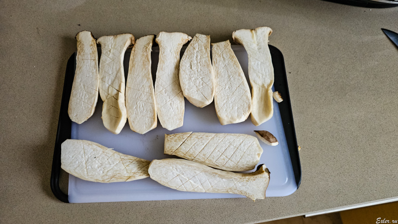 Вкусно, да, но в следующий раз буду готовить их так, как я обычно готовлю грибные смеси, которые тут покупаю. Порежу достаточно мелко - поперек на кружочки и еще пополам, - и обжарю в оливковом масле с луком. Мне кажется, что так будет лучше.