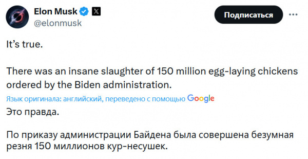 А Маск-то чего хотел? Чтобы американцев кормили яйцами от куриц, зараженным птичьим гриппом? Добрый он парень, как я посмотрю.