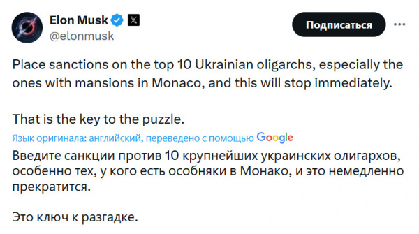 Товарищ Илон Маск знает, как остановить войну в Украине. Тут главное - не промахнуться и ввести санкции обязательно против тех украинских олигархов, у кого есть особняки в Монако. И тогда Путин немедленно остановится и перестанет вести войну в Украине. Гениально? Гениально!