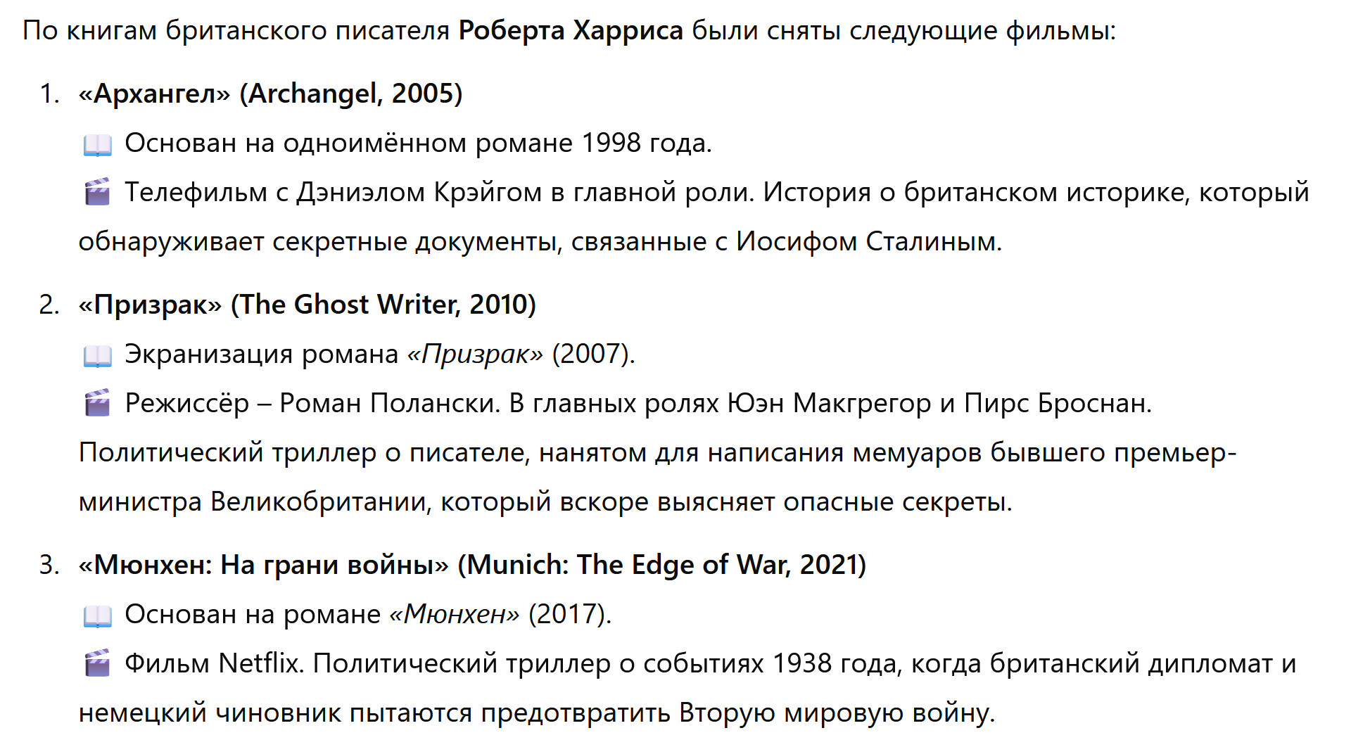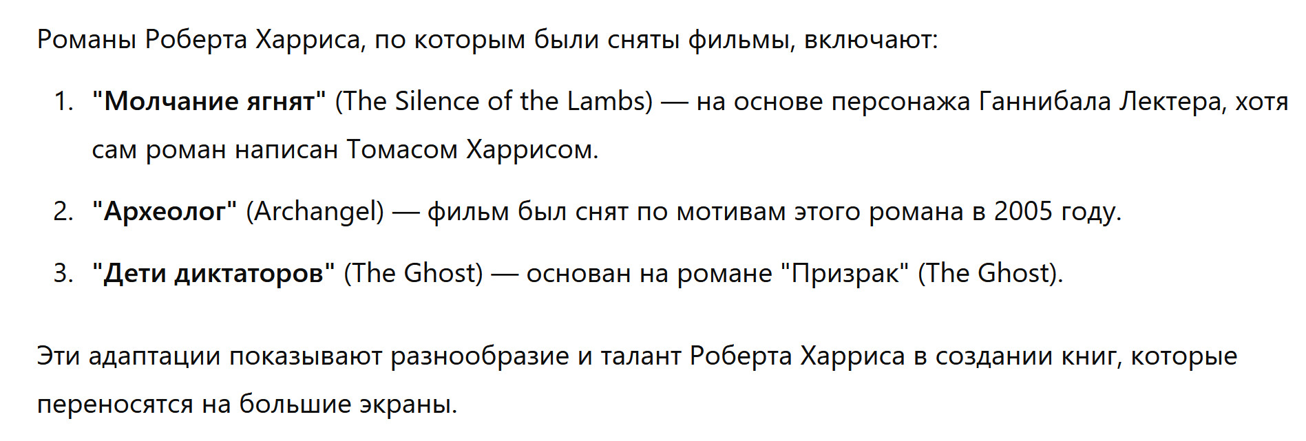 Например, спрашиваю модель ChatGPT-4o mini (которая, дескать, быстрая и подходит для большинства запросов) о том, какие фильмы поставлены по книгам писателя Роберта Харриса.