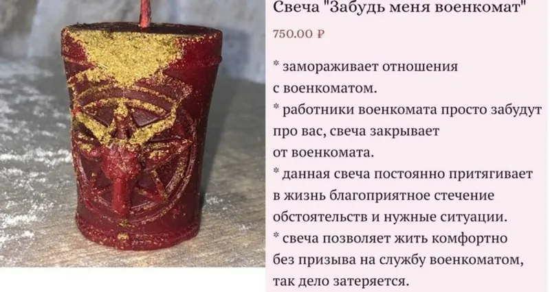 Вот, например, свеча "Забудь меня военкомат". 750 рублей всего, недорого. Правда, тут непонятно, как именно у свечи идет наведение на цель. А то один военкомат покупателя забудет, а другой, наоборот, вспомнит!
