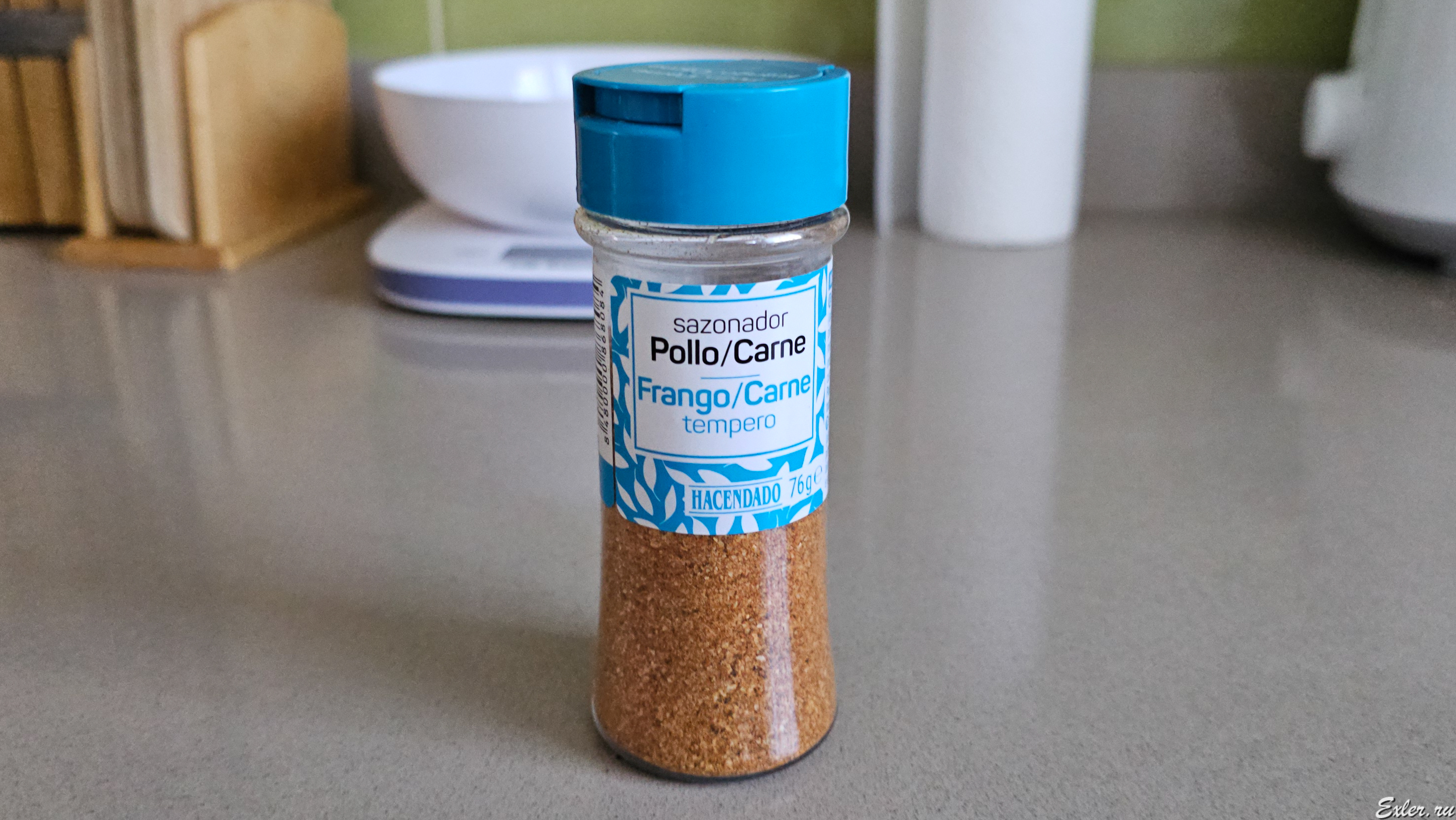 Дальше для удобства использования я пересыпаю часть смеси во флакончик из-под смеси для курицы из Меркадоны: саму смесь я выкинул, она мне не понравилась, а вот баночка - очень даже пригодилась, потому что только у Меркадоны баночки со специями - очень удобные, и там не приходится ломать ногти, чтобы их открывать.