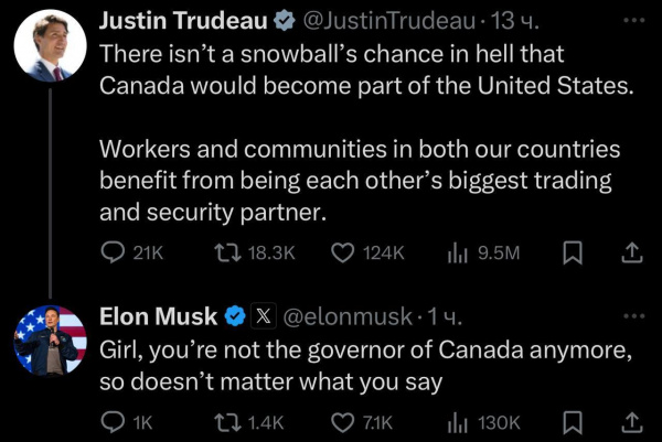 Товарищ Илон Маск в ответ написал: "Девочка, ты больше не правитель Канады, так что не важно, что ты говоришь".
