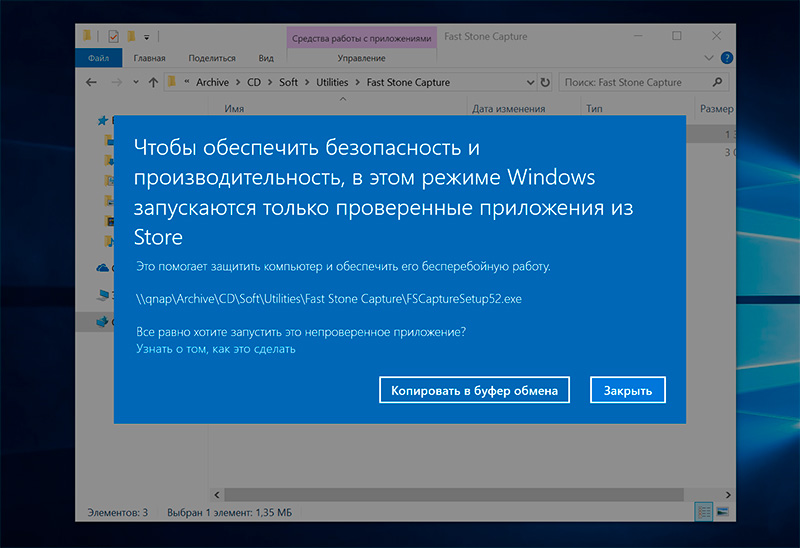 Сел поизучать дешевый ноутбук, который купил для теста. Там стоит лицензионная Windows в варианте "Домашняя". Правда за те несколько месяцев с момента покупки, когда на нем стояла просто "Домашняя", эта версия как-то трансформировалась в "Домашнюю S". И при попытке поставить мою любимую программу для создания скриншотов Faststone Captures мне Windows вдруг выдала следующее.
