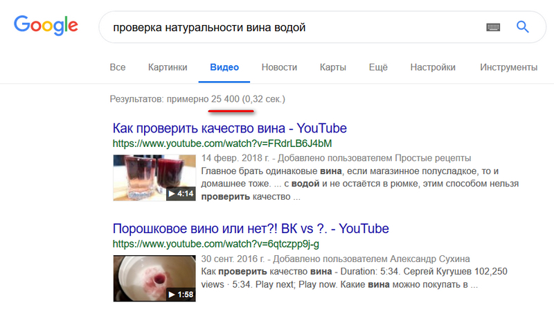По Сети гуляют тысячи и тысячи (а именно - двадцать пять тысяч) роликов, в которых рассказывается, как проверять "натуральность" вина с помощью воды. Бредовость этого способа зашкаливает на любом карманном бредометре, но пипл активно хавает, так же как и мифы о "порошковом" вине, которые не вытравить даже дустом.