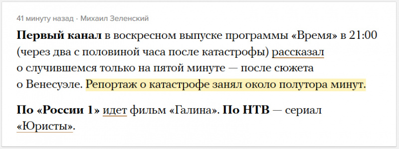 Врали сначала о том, что никто не погиб, есть только несколько человек раненых. Потом, долго и упорно говорили, что погиб один человек. Первый канал и «Россия» начинали выпуски новостей с беспокоящей их Венесуэлы, подчеркивая тем самым, что пожар в Шереметьево всего лишь неприятное происшествие, но не трагедия.