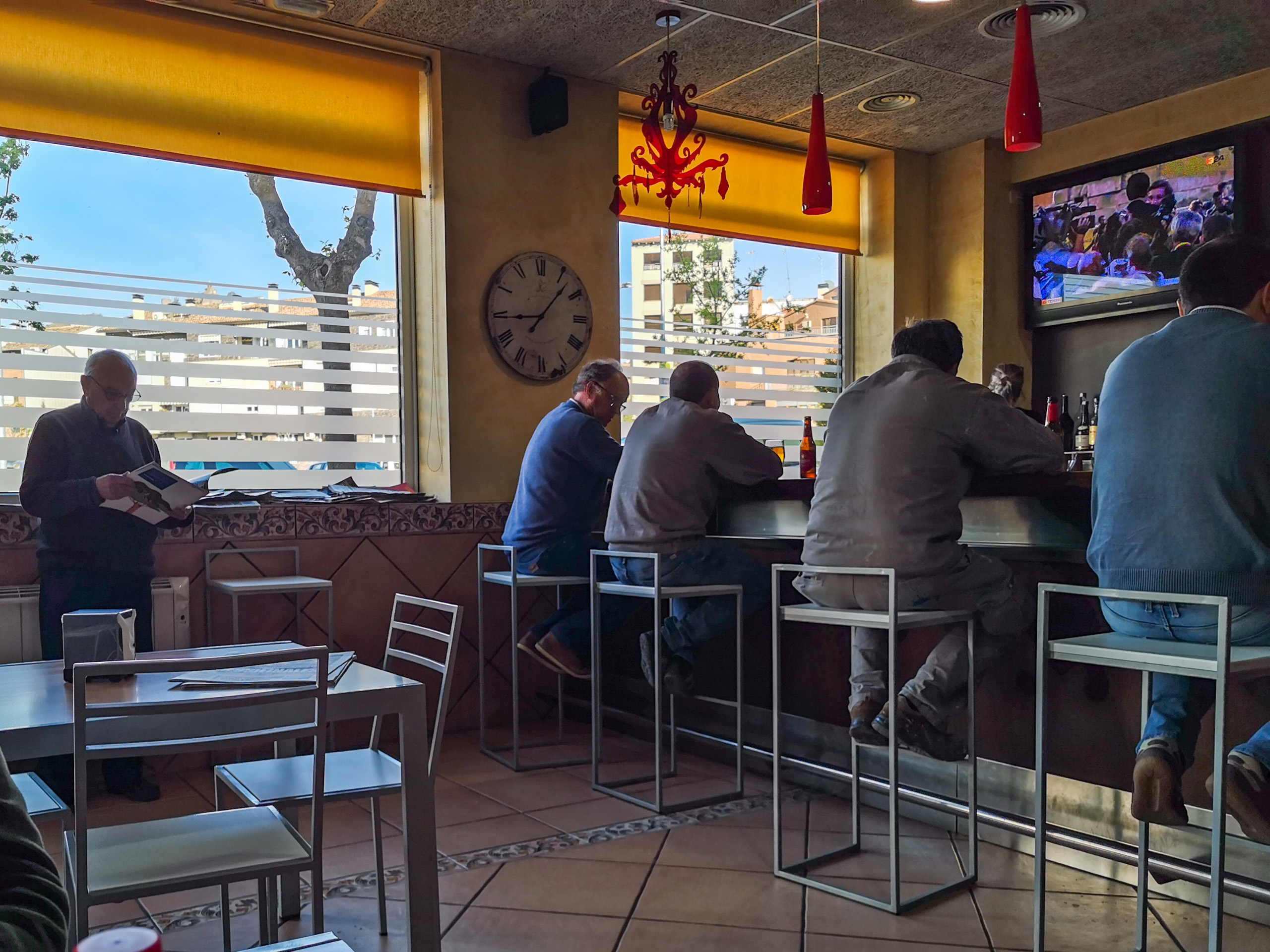 Обожаю утренние испанские кафешки - они такие колоритные. Каталанский городок Сольсона. Девять утра. На стойке слева - два пенсионера пьют по бутылочке пивка, обсуждая, разумеется, Индепенденсию. Справа от них - работяга с бутылочкой пивка и бутербродом (называется "бокадильо") смотрит телевизор. Справа от работяги - какой-то иностранец из нашей гостиницы, пьет кофе.