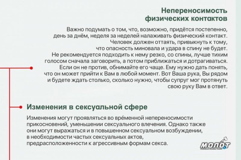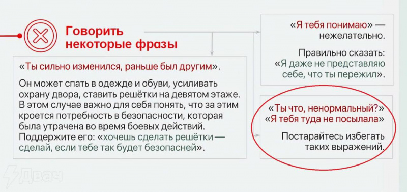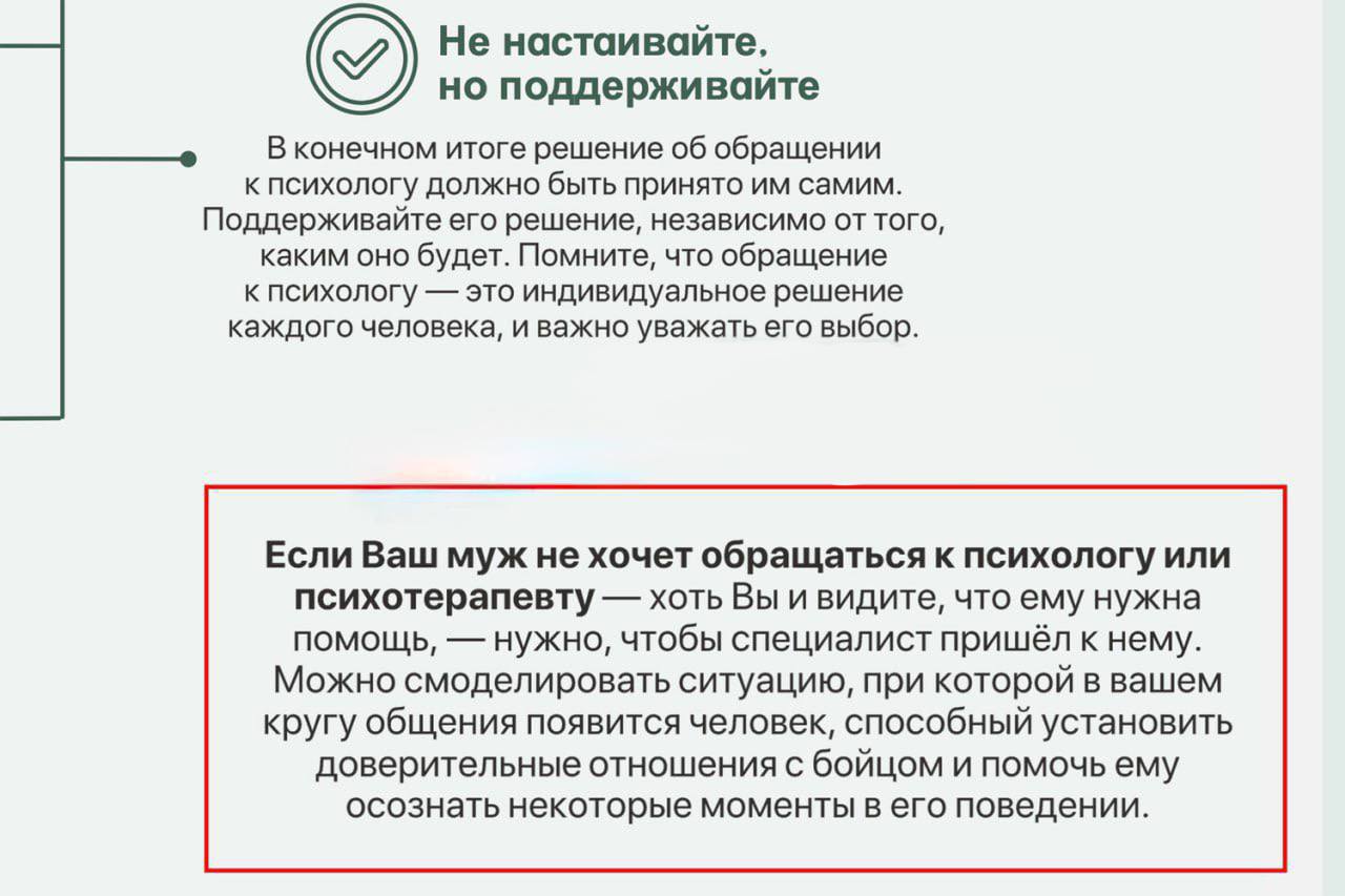 Три российские автономные некоммерческие организации — «Ценим Жизнь», «Соратник» и «ГаГаРа» — подготовили памятку с советами для жен участников специальной военной операции на Украине. Пока документ в онлайн-формате распространяют через благотворительные организации в Татарстане и Челябинской области, а печатные версии раздают солдатам в зоне боевых действий и продвигают через республиканскую психиатрическую больницу в Татарстане.