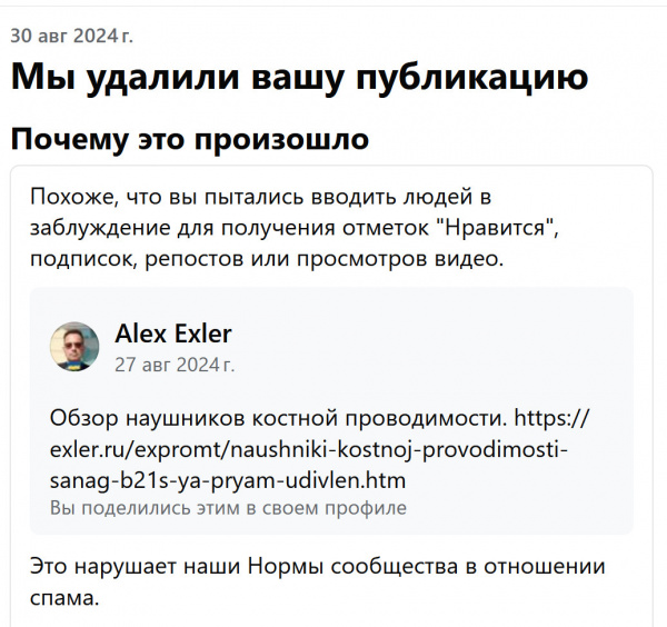 Фейсбук удалил анонс моего обзора наушников по причине того, что я "пытался вводить людей в заблуждение для получения отметок "Нравится"". Фееричненько, конечно... А меня еще спрашивают, почему я практически перестал что-то писать в Facebook.