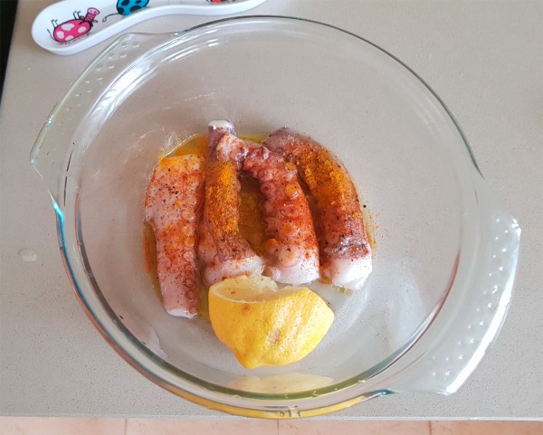 Одну порцию сделал в духовке. Щупальца осьминога, оливковое масло, полить соком лимона, кинуть лимон в кастрюльку, черный перец, сладкий красный перец, чуть-чуть кайенского перца и немного белого вина.