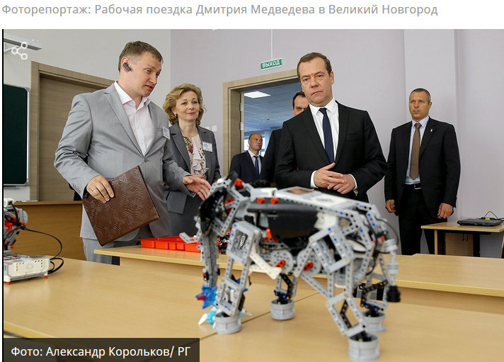 Однако не спешите делать ложные выводы. Ведь боевой слон, киберслон, у России все-таки есть! Именно его показали премьеру Медведеву во время его визита в Великий Новгород, где местные кулибины демонстрировали Медведеву всякие инновации. Премьер еще пообещал выделить на НТИ 12,5 миллиардов рублей, цитирую: