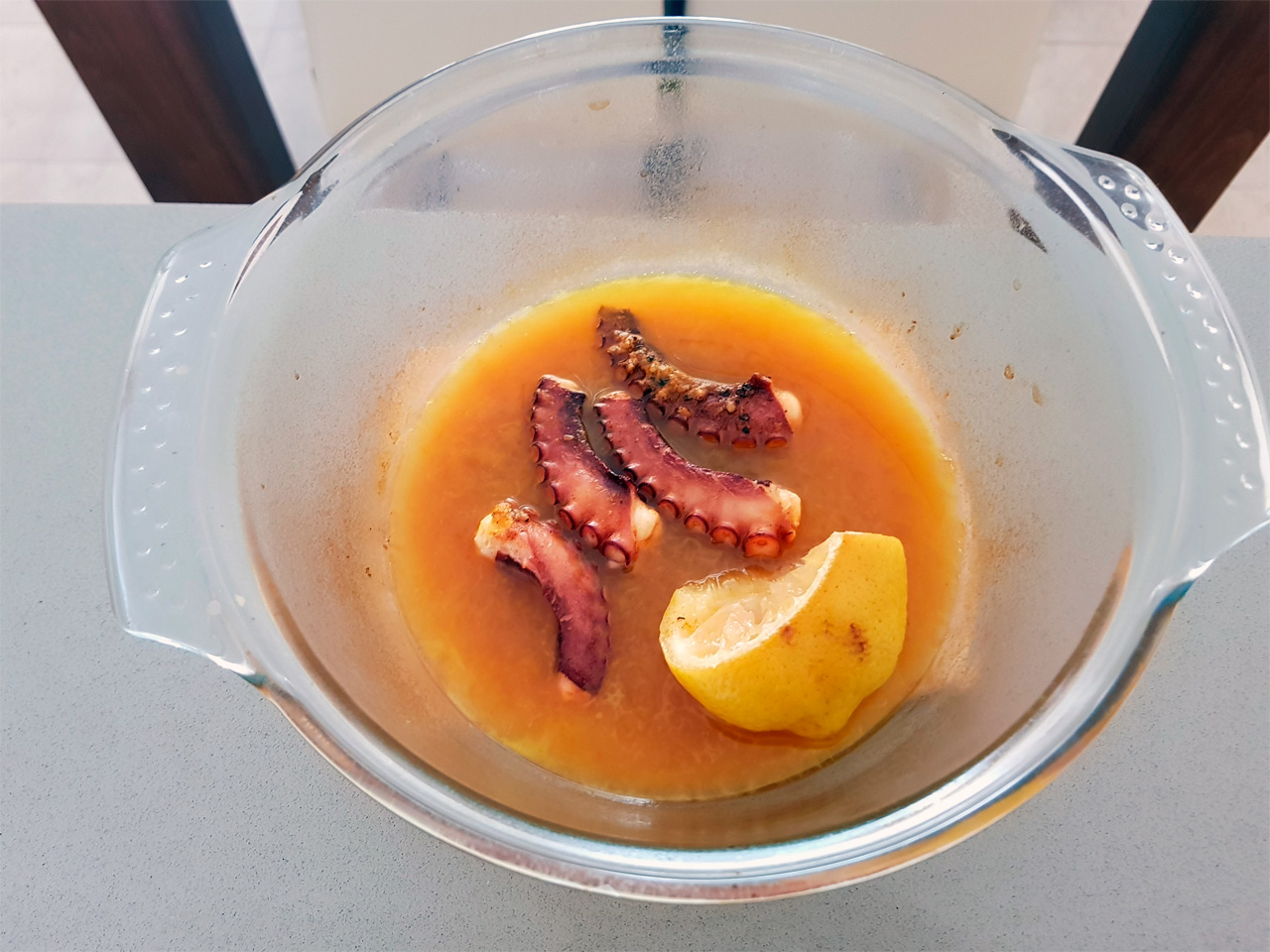 Вынул через час - щупальца конкретно ужарились, что неудивительно - там выходит много воды. На вкус - нежнейшее мясо, просто отличное. Несмотря на то, что и не отбивал, и не морозил. Единственное - в сочетании белого вина и лимона явно что-то лишнее. В следующий раз, наверное, не буду туда белое вино добавлять.