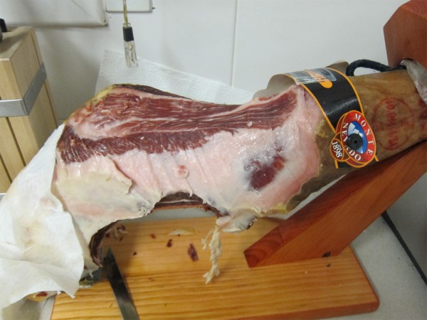 Писал про ляжку Jamon Iberico Monte Nevado и говорил, что мне она не особенно понравилась. Но мы ее подъели с внешней стороны, перевернули на нижнюю - а там мясо намного вкуснее и нежнее. Я и не знал, что две стороны одного хамона так отличаются - как-то раньше вроде с этим не сталкивался. Вот так должен выглядеть качественный хамон.