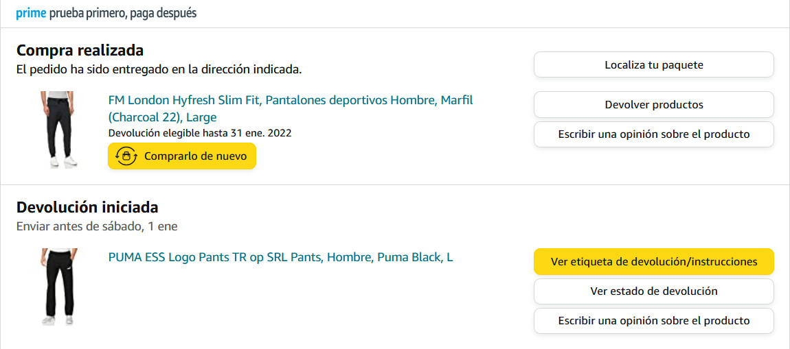 Заказал. Приехало. Кофта отлично подошла, брюки FM London HyFresh - то что надо, а вот брюки PUMA - пролет: обычный L оказался сильно больше, чем надо. Ну, не вопрос: зашел в заказ, выбрал поменять. Поменять не дали - нет такого размера. Но вернуть - без проблем. Нажал кнопку "Вернуть": написали, что внутри упаковки уже лежит распечатанная этикетка возврата. Брюки нужно положить в пакет, на пакет наклеить этикетку, оставить пакет в ближайшем амазоновском пункте (они есть практически в каждом городке). Ну и все!