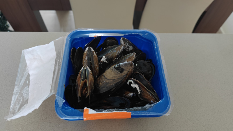 Некоторое время назад я мидии не особо любил, но потом, что называется, распробовал и теперь даже временами заказываю в ресторанах. Там они, правда, обычно подаются со всякими хитровыдуманными соусами, а вот для дома для семьи можно купить вот такую упаковочку в "Меркадоне" - 750 граммов здоровенных мидий с каким-то простеньким соусом. Тут главное - простота приготовления. Засунул в микроволновку на 600 Вт на 6-7 минут - и все, блюдо готово. Красота!