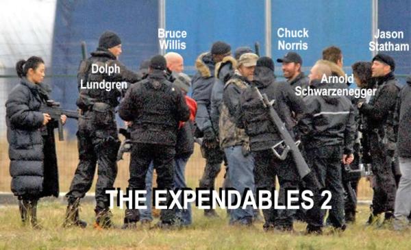 Готовятся к выходу "Неудержимые 2". (Первый фильм мне понравился.) Посмотрите, какую компанию собрал старина Слай. Даже Норриса вытащил, не говоря уж о Шварце.