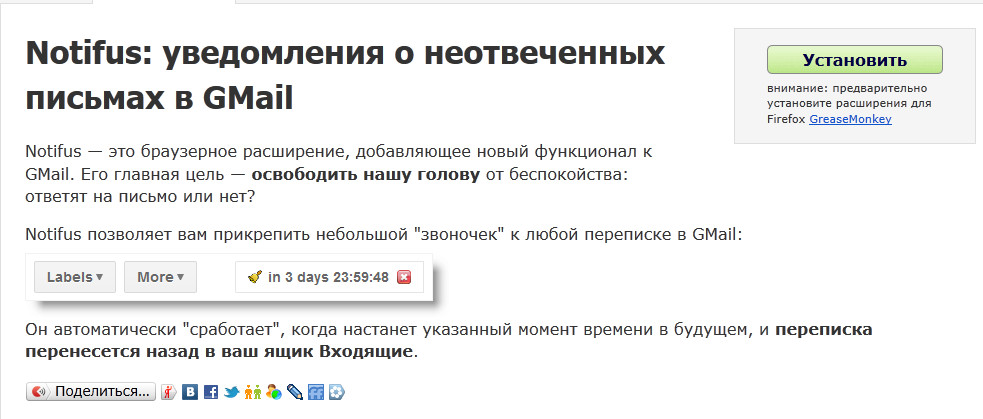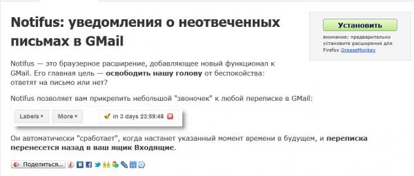 Notifus — это браузерное расширение, добавляющее новый функционал к GMail. Его главная цель — освободить нашу голову от беспокойства: ответят на письмо или нет. Notifus позволяет вам прикрепить небольшой "звоночек" к любой переписке в GMail. Он автоматически "сработает", когда настанет указанный момент времени в будущем, и переписка перенесется назад в ваш ящик Входящие.