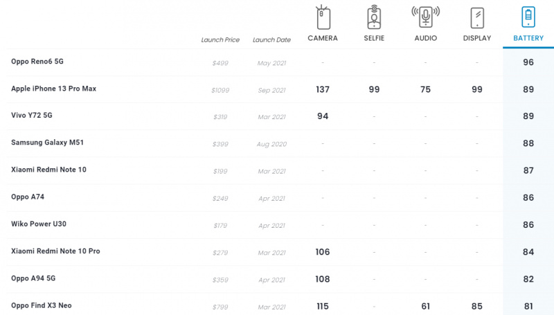 А тут еще в лаборатории DXOMark протестировали его автономность (правда, они тестировали немного другую модификацию - OPPO Reno6 5G на MediaTek MT6877 Dimensity 900, у которого 4300 мАч и зарядка 65 ватт - в России этой модификации пока нет), и данный смартфон неожиданно получил по автономности первое место в рейтинговой таблице, обогнав даже iPhone 13 Pro Max, который до этого был рекордсменом.