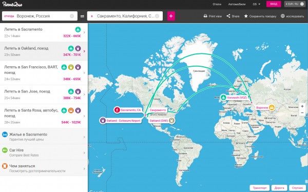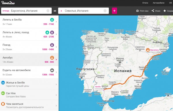 Вы спросите, в чем отличие от Google Maps, который умеет делать что-то похожее? Отличие, во-первых, в том, что этот сервис умеет прокладывать автобусные маршруты (Google только поезда), во-вторых, он умеет комбинировать различные виды транспорта, в-третьих, он прикидывает приблизительную стоимость проезда, в-четвертых, он прокладывает разные маршруты и пишет продолжительность каждого из них.