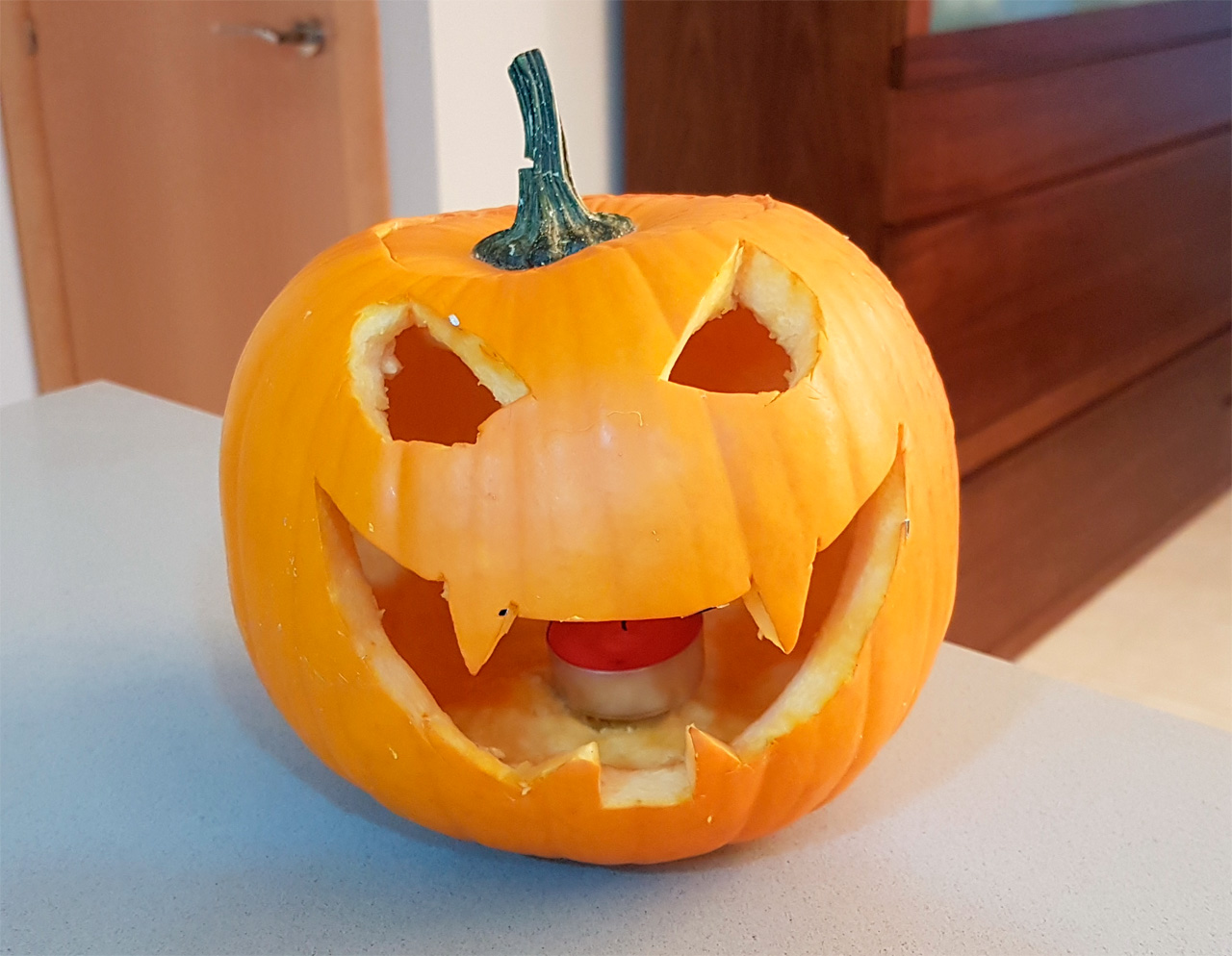Но это еще ладно. Перед ужином зашли в магазин, ребенок там прикупил себе тыкву, из которой надо сделать традиционную хеллоуинскую маску. На тыкве навешена здоровенная наклейка с рекламой конторы, которая эти тыквы выпускает. Пришли домой, ребенок стал рваться начать вырезать маску из тыквы, но ему объяснили, что мы сейчас садимся ужинать, так что тыквой он займется не раньше завтра.