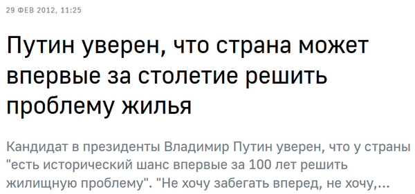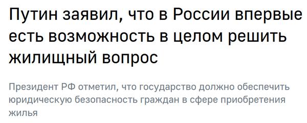 "Ситуация такова, что мы впервые за всю, может быть, историю, еще и царской, и советской России, и современной России в состоянии решить эту задачу [обеспечения жильем] в целом", - сказал он. (Отсюда.)