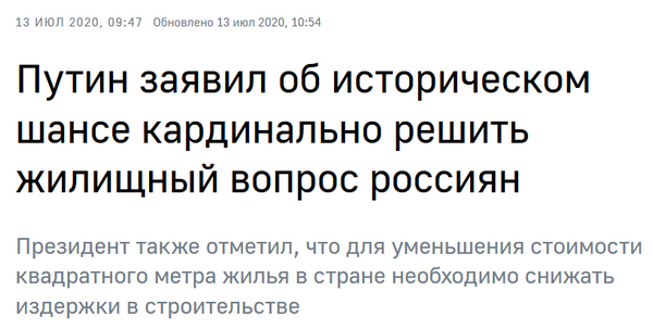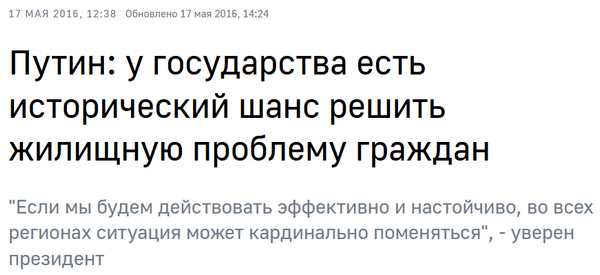 "У нас есть исторический шанс в обозримые сроки, абсолютно понятные, может быть, впервые за всю историю России кардинально решить жилищный вопрос. Нужно не упустить этот шанс. Над этим нужно настойчиво работать", - сказал он. "Это одно из фундаментальных условий нормальной жизни человека и российской семьи", - подчеркнул президент. (Отсюда.)