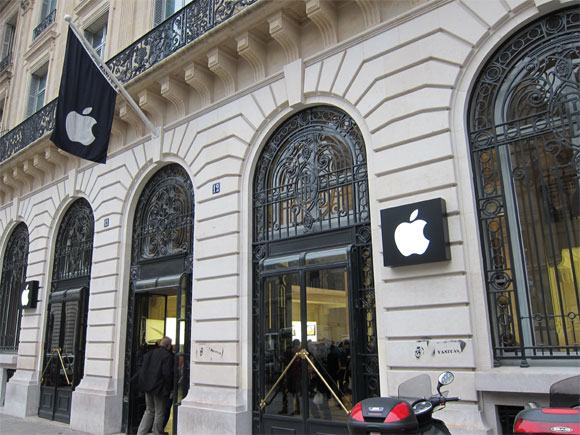 В Париже Apple Store со стороны выглядит как-то траурно. Хотя внутри - аж три этажа: подвальчик, здоровенный первый этаж и еще балкончик.