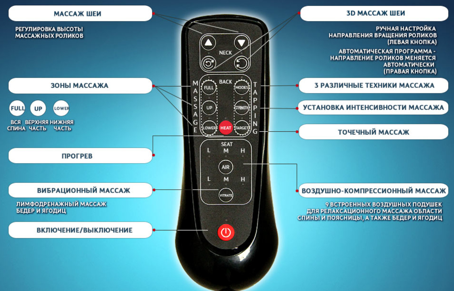 Накидка умеет делать: массаж шеи, 3D-массаж шеи, массаж различных зон спины, воздушно-компрессионный массаж областей спины, поясницы, бедер и ягодиц, лимфодренажный массаж бедер и ягодиц, точечный массаж, прогрев зон массажа.