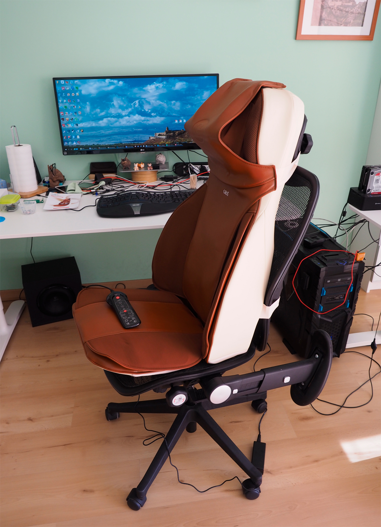Однако, как выяснилось, все-таки есть вариант получить несколько усеченный вариант массажного кресла (без ног, но зато с задницей, спиной и плечами-шеей), который и места занимает совсем немного, и стоит в районе 30 тысяч (менее 500 евро).