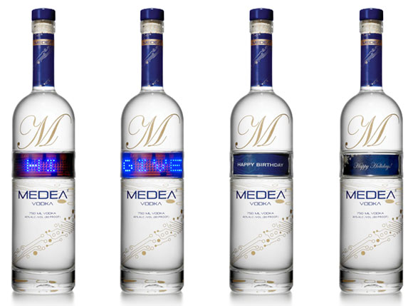 Голландская водочная компания Medea собирается расфасовывать свою продукцию в бутылки с LED-экраном. Всего бутылка сможет запомнить 6 текстовых сообщений по 256 символов. Вводить текст можно по помощи 4 кнопок, по очереди перебирая символы алфавита. Для экономии батарейки каждое из сообщений демонстрируется в течение трех минут. Всего же экран может беспрерывно работать 40 часов или находится целый год в режиме ожидания. Прямо как мобильный телефон.