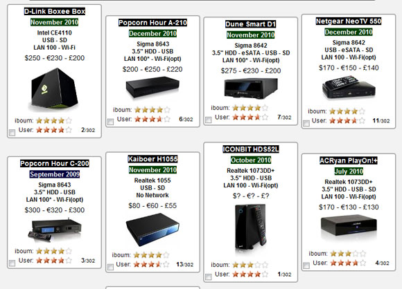 Top медиаплееров по версии издания Iboum и их читателей. В первой пятерке ожидаемо Popcorn Hour A-210 и С-200, новая Dune. Но что было для меня полной неожиданностью, на первом месте - D-Link Boxee Box, только что появившийся на рынке. У нас его еще, судя по всему, нет, но когда появится - обязательно достану потестировать. Вот уж раньше D-Link как-то не был замечен в выпуске медиаплееров. Посмотрим, посмотрим... Также на 4-е место они поставили только выпущенный Netgear NeoTV 550. Аналогично - надо будет глянуть.